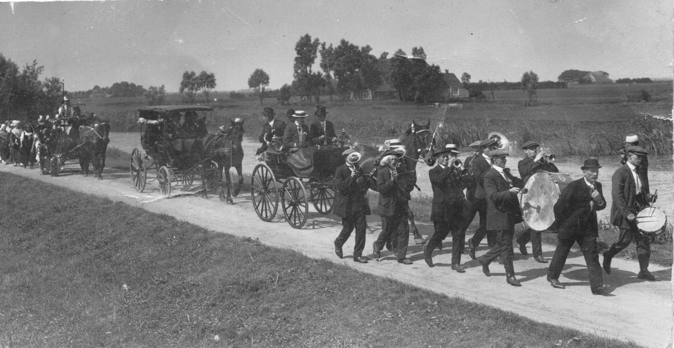 Dorpsfeesten zijn van alle tijden. De oudste foto van een feest in onze dorpen is ook nog een foto met muziek. De foto is gemaakt bij het “onafhankelijkheidsfeest” van 1913, dat groots gevierd werd in Terkaple-Akmarijp.