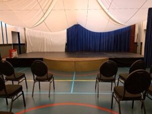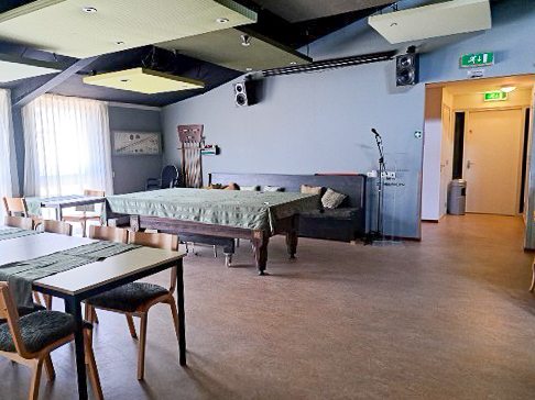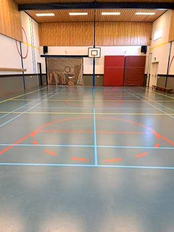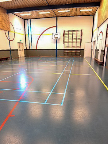 De sportzaal is 21×14 meter en ziet er goed en volledig uit. Een mooie vloer met lijnen voor basketbal en volleybal. De sportzaal is volledig uitgerust met gymmaterialen, sportnetten en baskets.